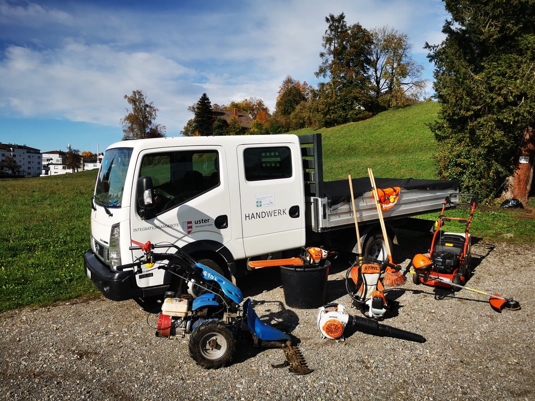 Die «Integrationsangebote Stadt Uster» bieten mit «Handwerk» Gruppeneinsatzplätze für Personen mit Anspruch auf Sozialhilfe oder Asylfürsorge. Es werden Aufträge für Kunden verschiedenster Art sowohl im Grün- wie auch im handwerklichen Bereich ausgeführt.